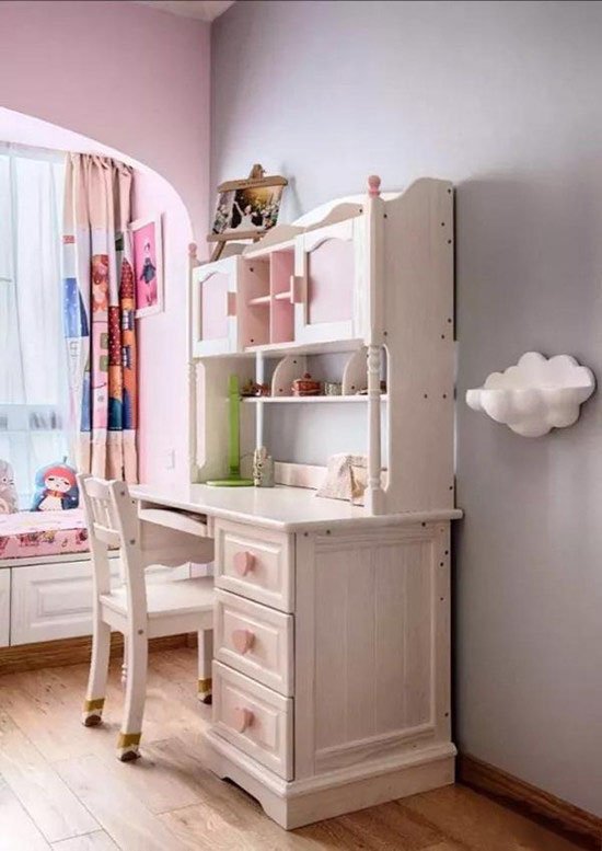 【儿童房】儿童房的设计显得比较粉嫩,粉色的墙面搭配白色的上下铺和书桌,实用又好看。另外飘窗处榻榻米的设计,既可以作为休息区也能作为娱乐区,舒适实用。