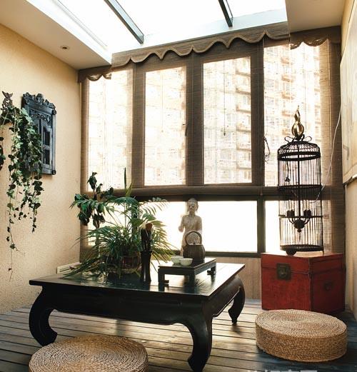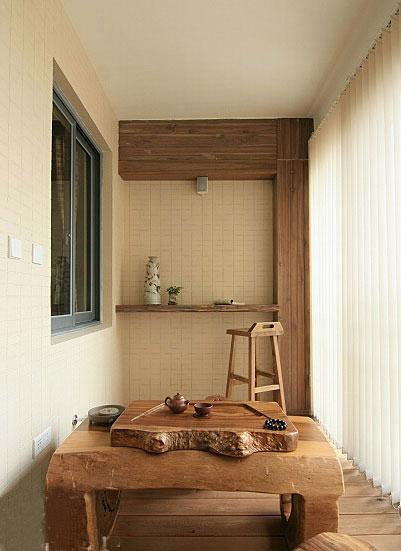 像在阳台,放一张茶几,两块古朴的座椅都是非常别致的